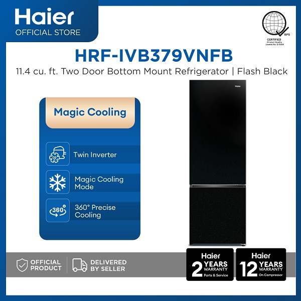 ₱21998 [HOT DEALS] Haier HRF-IVB379VNFB 11.4 cu.ft./324L Magic Cooling No Frost Bottom Freezer Twin Inverter Two Door Refrigerator (New Model)