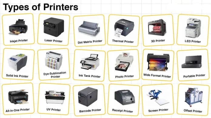 | Laser Printer | Uses toner powder and laser technology; fast, precise, ideal for offices. |