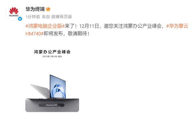 Huawei Terminal has officially announced that the Huawei Qingyun HM740 will debut on December 11, positioned as the enterprise edition HarmonyOS computer.