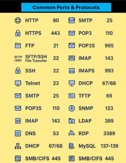 - Best practice: Only keep necessary ports open, and secure protocols (HTTPS, SSH) should replace insecure ones (HTTP, Telnet).