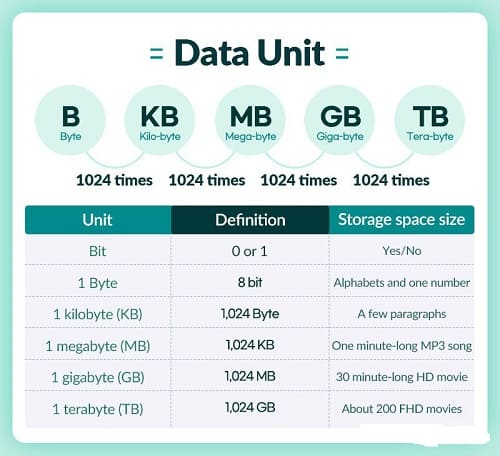 - Kilobyte (KB) → ≈ 1,000 bytes (sometimes 1,024 in computing)